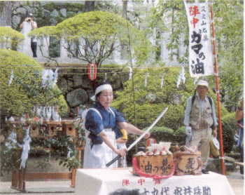 このガマの油というのは、センソという中国からの輸入品を加えたもの、センソというのは中国語で「ガマの素」という意味で、ガマを集めて押え、絞り出した汁に糊を加えて煎餅状にしたもの、これを日本では膏薬にまぜたり、飲み薬にしていた。膏薬は、切り傷に良く効き、血も止まり痛みもやわらいだ。大阪冬の陣、夏の陣(1614、1615年)では、筑波山の光誉上人が徳川方にあって陣中で戦勝祈願のお経を上げていたが、このガマの素の入った膏薬をケガ人に授けて良く効くと評判になった。そして、このおかげで、光誉上人はガマ上人と言われるようになった。このガマの油は光誉上人の頃からの筑波名物だと言い伝えられている。